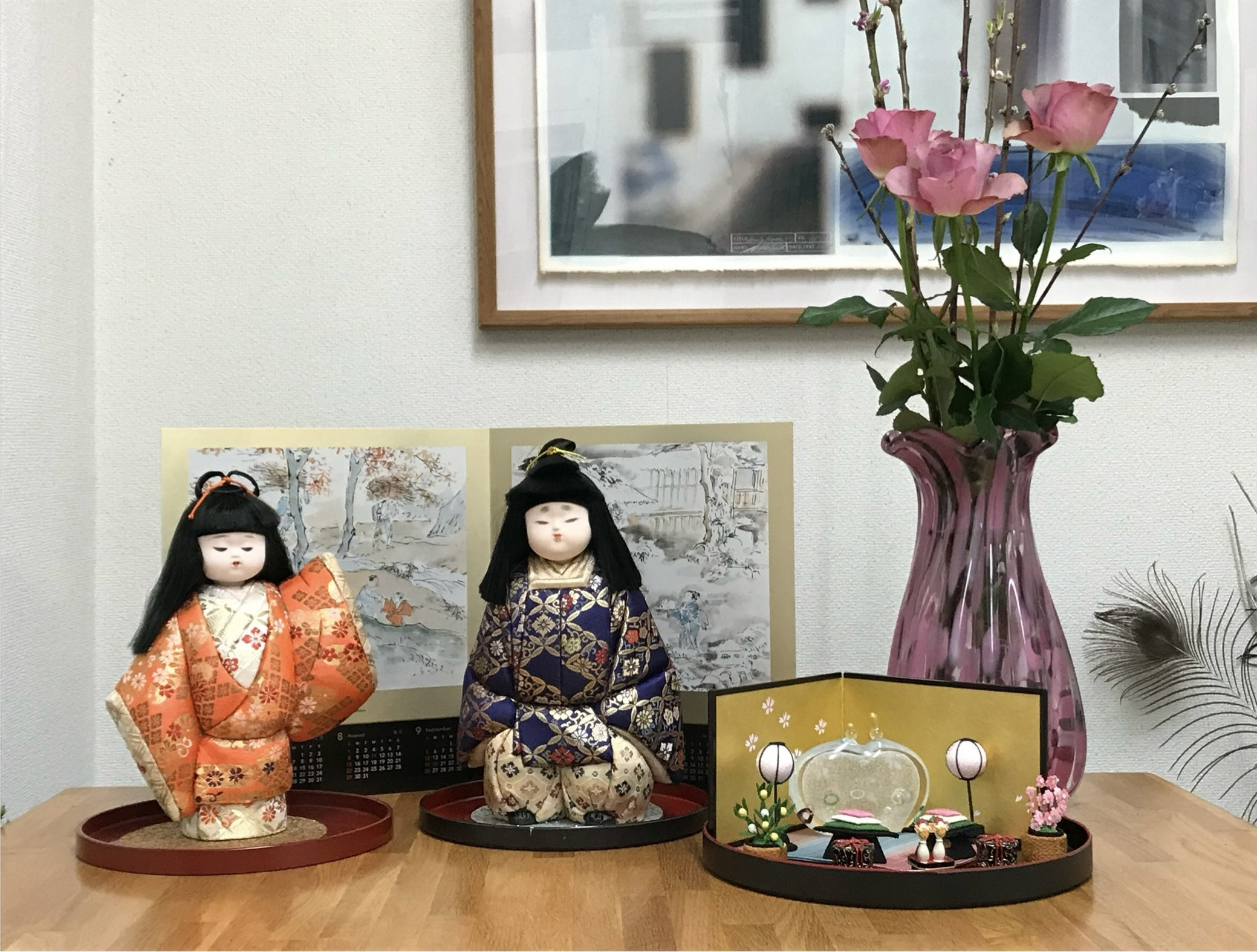 26年前に訪れたギャラリーで一目惚れして求めたガラスのお雛様。今年も小さなお盆の上でお道具に囲まれ凛としています。小学生の「あ、おひなさま!」の声に母が創った木目込み人形も嬉しそう。